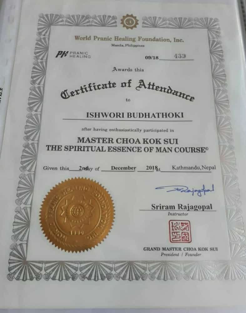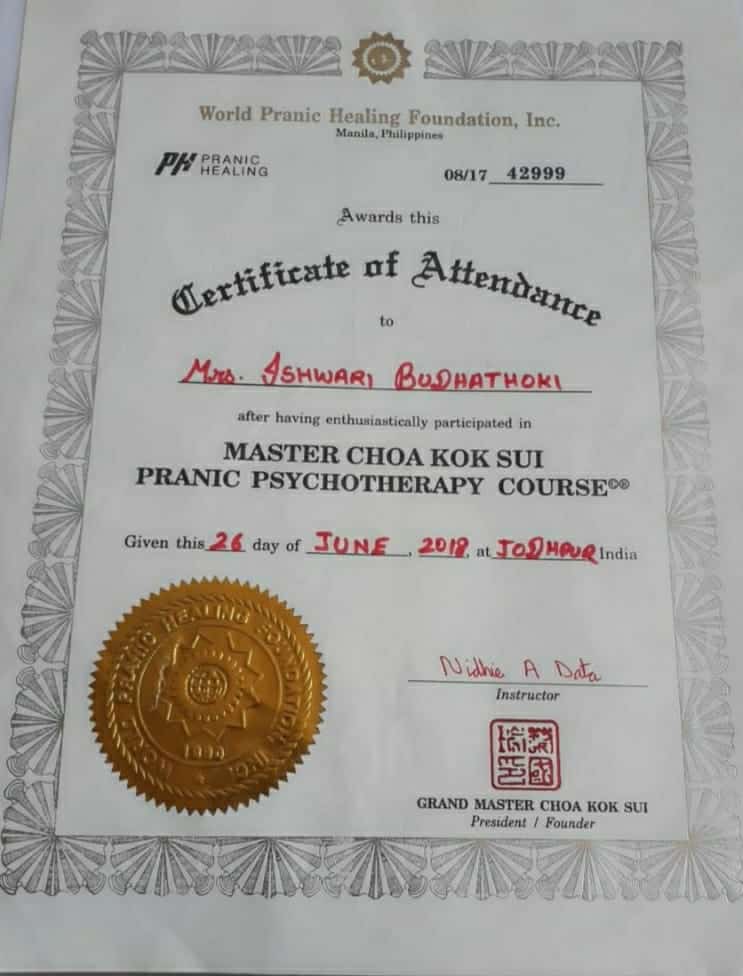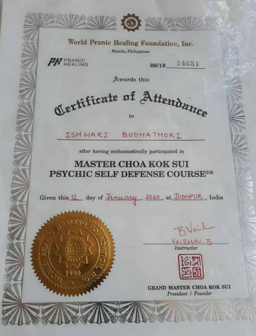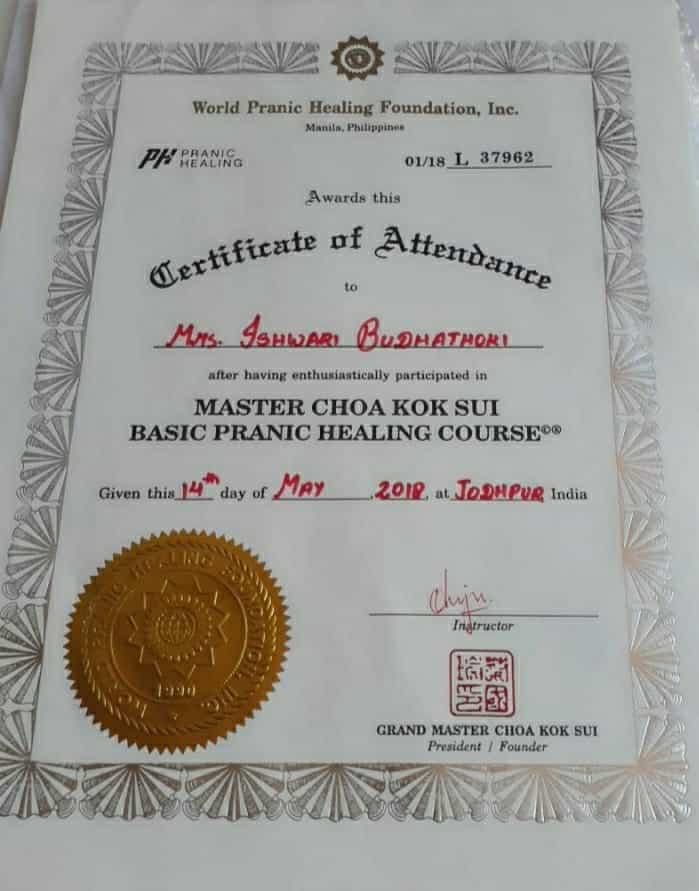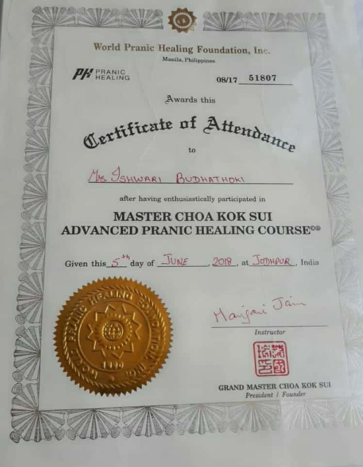 Ishwori Budhathoki is a spiritual healer and Pranic healer in Shobhawoto ki Dhani, Jodhpur, Rajasthan. She is basically from Kathmandu, Nepal. Initially, she was introduced to pranic healing to resolve her personal issues, and then it became a path to her spiritual journey.