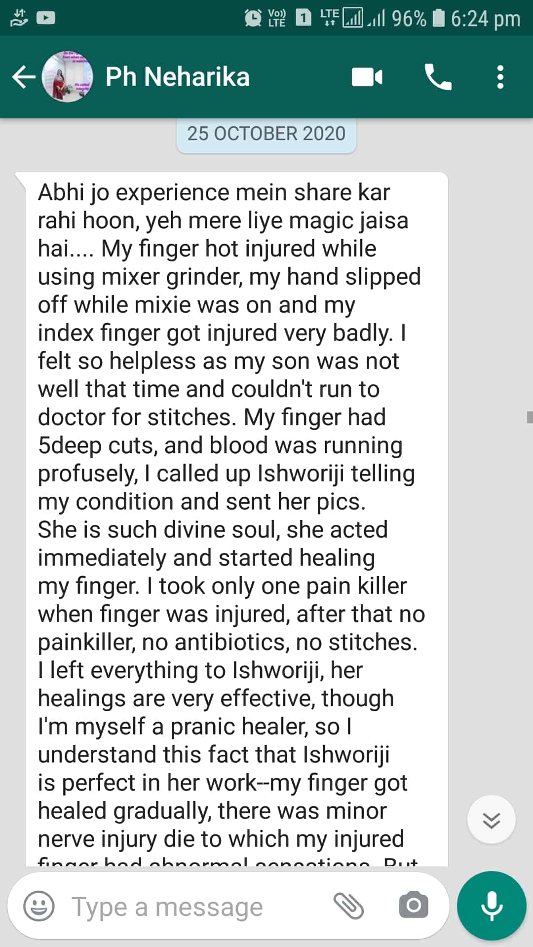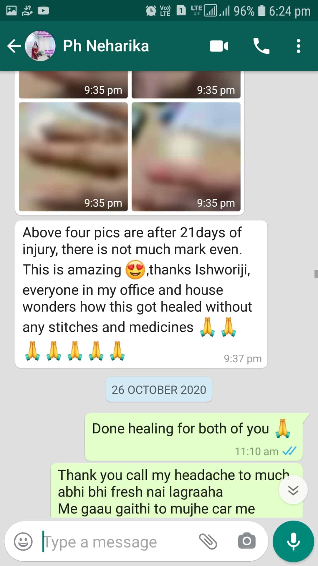My healing started and I took only 4 healing sessions to recover. It was a great experience as this time,| I didn’t have to take any medicine.